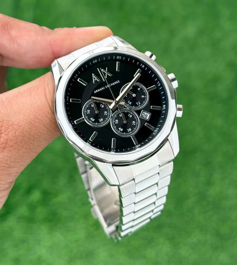 The Armani Exchange Chronograph is a stylish timepiece that seamlessly blends functionality with modern design. The striking black dial features all chronographs working perfectly, making it not just a watch, but a statement of precision. With its round silver case and a full silver matte strap, it offers an eye-catching contrast that is sure to catch attention.