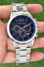 The Armani Exchange Chronograph Silver Blue Dial is a perfect blend of style and functionality, designed for those who appreciate precision in their timepieces. The striking blue dial, adorned with working chronographs, not only enhances readability but also adds a pop of color against the sophisticated silver backdrop.
