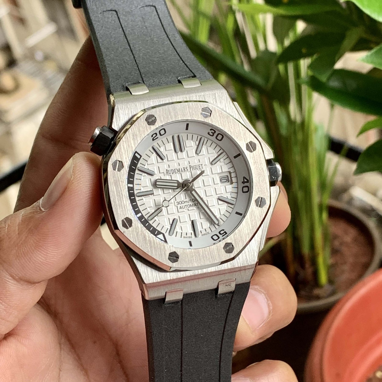 The Audemars Piguet Offshore Diver White Dial is a stylish watch with a 44mm stainless steel case, white dial, and high-quality silicone straps.