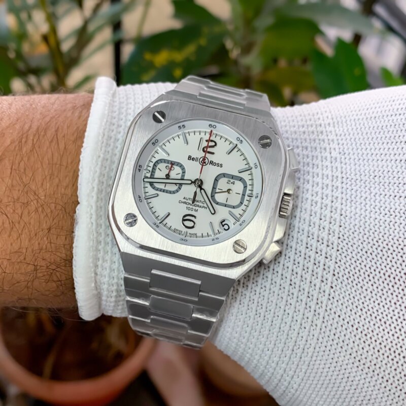 The Bell & Ross BR-05 Urban Chronograph features a sleek white dial, stainless steel case, and a reliable Japanese quartz movement, perfect for any occasion.