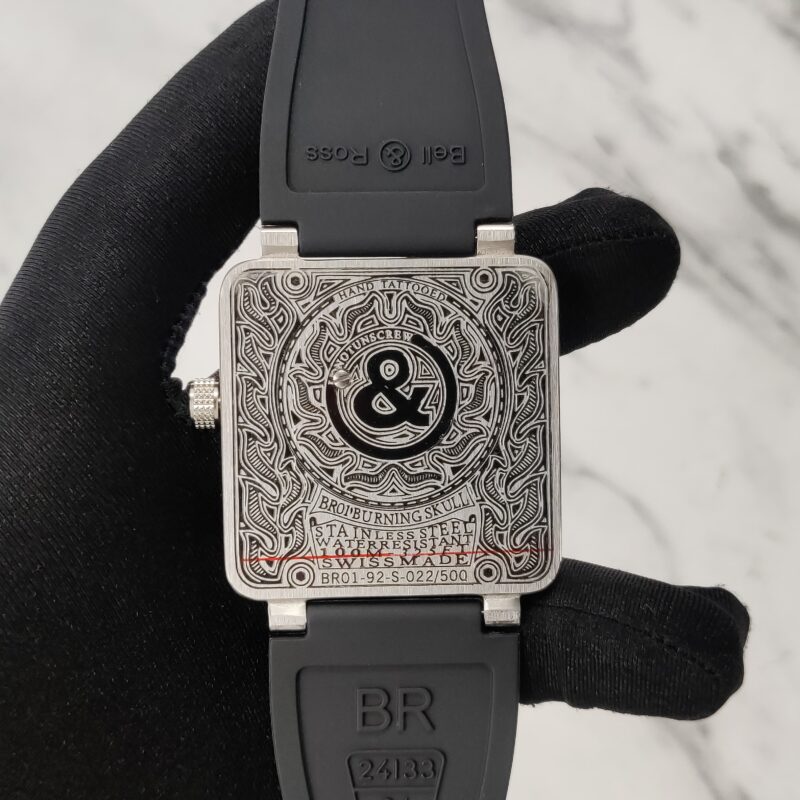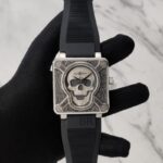 The Bell & Ross Burning Skull Grey Broad Square is a striking watch that combines bold design with reliable functionality. The stainless-steel case, engraved with a distinctive skull motif, sets a daring tone that captures attention while showcasing your unique style.