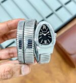 The Bvlgari Serpenti Tubogas is an exquisite piece that embodies elegance and sophistication. With its striking silver snake strap, it offers a unique design that wraps around your wrist, making a bold statement. The luminous black dial contrasts beautifully with the silver bezel, ensuring readability while adding a touch of allure.