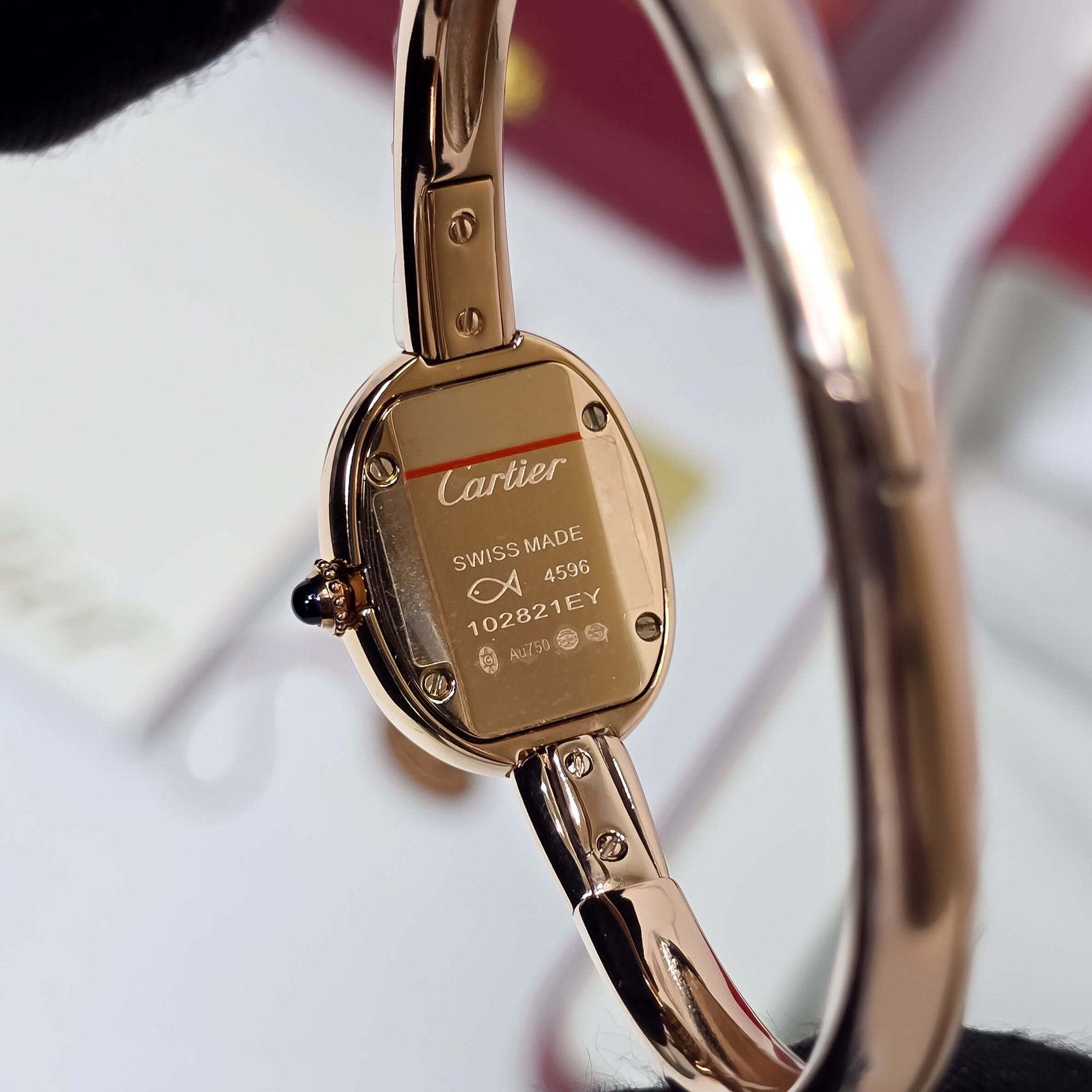 The Cartier Baignoire Bangle WGBA0019 is an elegant timepiece featuring a stunning oval case, Japanese quartz movement, and a stylish RGOLD-tone bangle.
