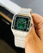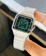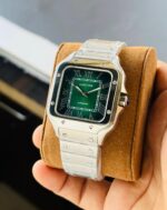 The Cartier Santos Silver Green Dial is a stunning blend of style and functionality, perfect for any man who values sophistication. With its bold 43mm geometric case and eye-catching patent Roman green dial, this watch is not just a timepiece; it’s a statement.