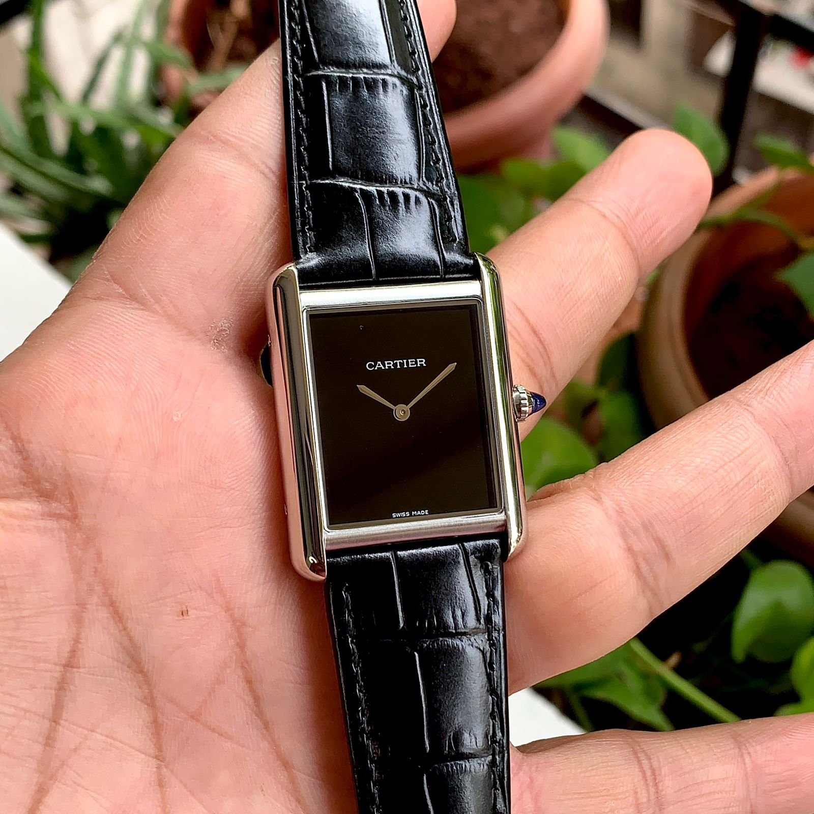 The Cartier Tank Must Large WSTA0072 is a stunning piece that embodies elegance and versatility, designed for anyone who appreciates a timeless watch. The sleek stainless-steel silver rectangular case harmonizes beautifully with the black dial, offering a sophisticated contrast that makes this watch a true standout.