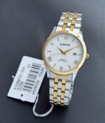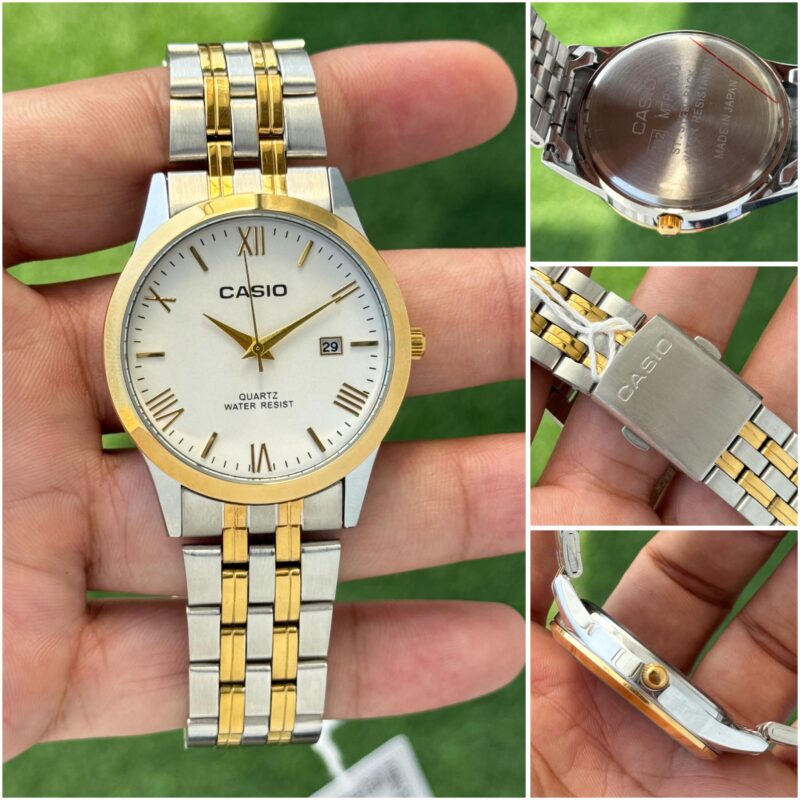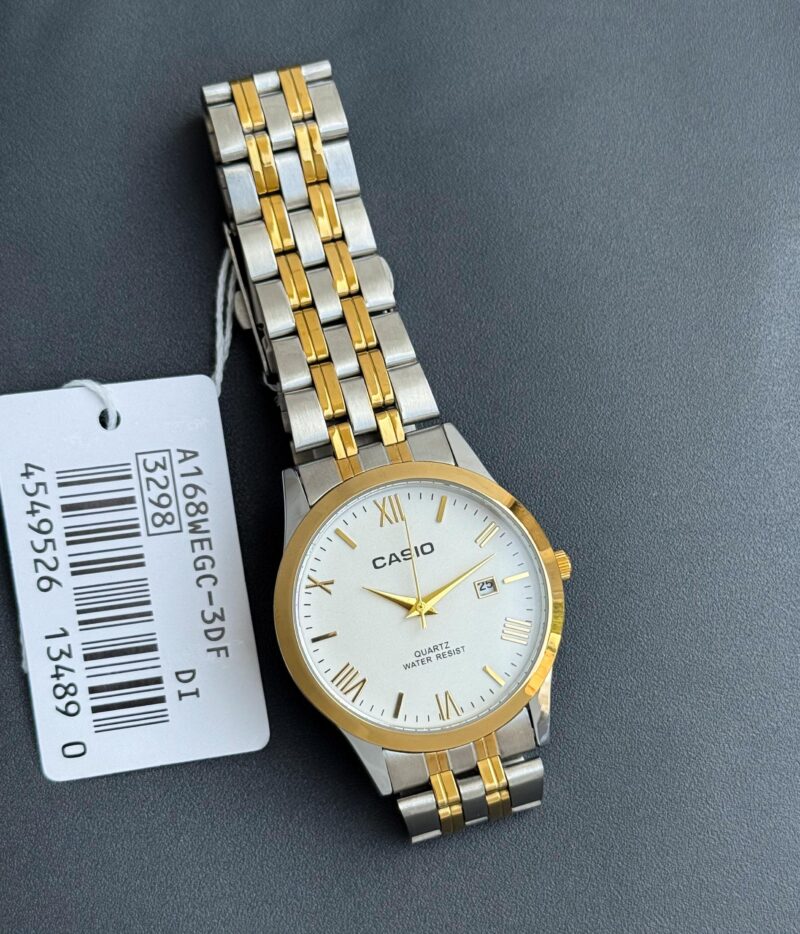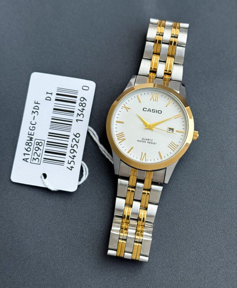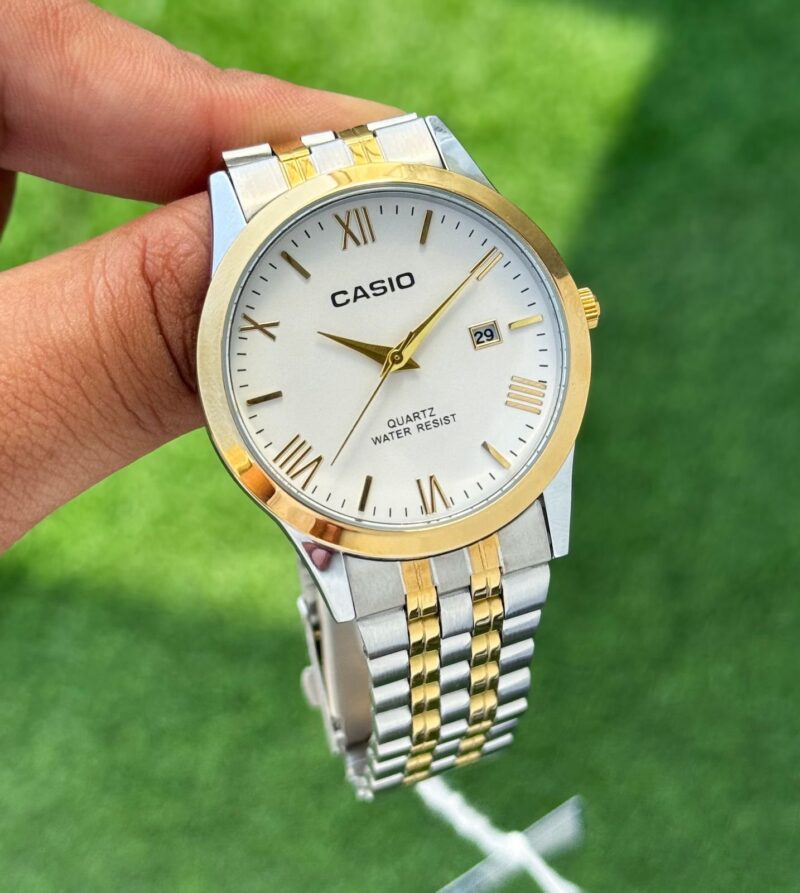 The Casio Classic Two Tone White Dial watch is a perfect blend of style and functionality. Designed for formal occasions, this timepiece stands out with its elegant white dial adorned with Roman numerals, offering a timeless appeal.