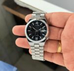 Powered by a reliable quartz sweep movement, this timepiece offers precision and durability. Plus, the handy date counter adds to its practicality. The elegant three-link black stainless steel bracelet not only enhances its aesthetic appeal but also promises lasting wear with its IGP color coating, which resists rust and fading.