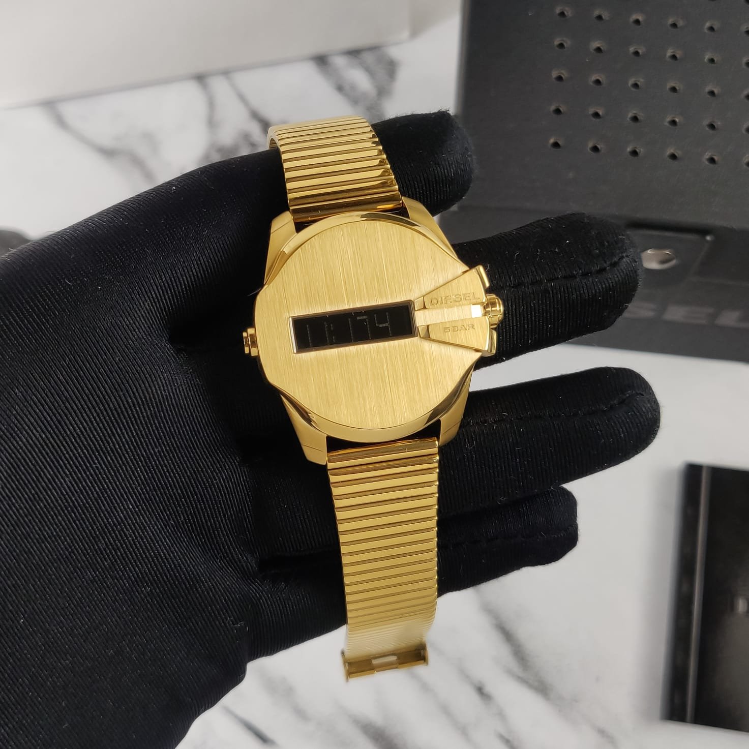 This Diesel Baby Chief DZ1961 features a gold stainless-steel case and a negative display, powered by Japanese digital movement for reliable timekeeping.