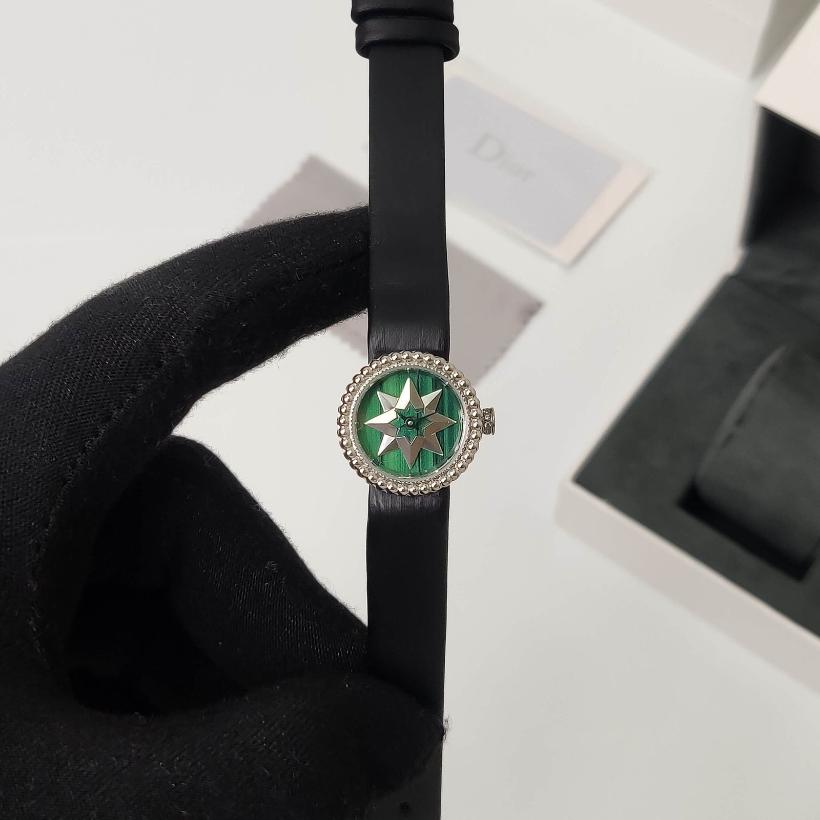 The Dior Mini D De Dior Rose Des Vents CD040112A003 is a stunning piece that beautifully blends elegance with functionality. Its 19mm stainless steel case is perfectly complemented by a green dial adorned with a unique center motif, creating a captivating focal point that draws the eye. The mineral crystal glass adds durability while maintaining clarity, ensuring that this watch remains a reliable companion.