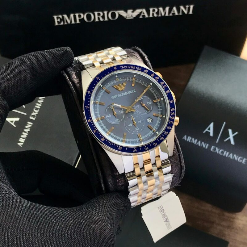 Discover the Emporio Armani AR6088 Chronograph watch, featuring a blue dial, working chronographs, and a stylish two-tone chain belt.