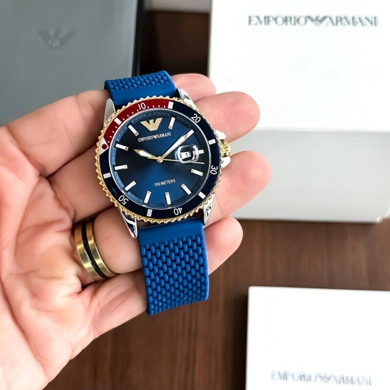 Discover the Emporio Armani Diver AR11340, a blend of durability and style with a blue face, golden bezel, and premium features for everyday wear.
