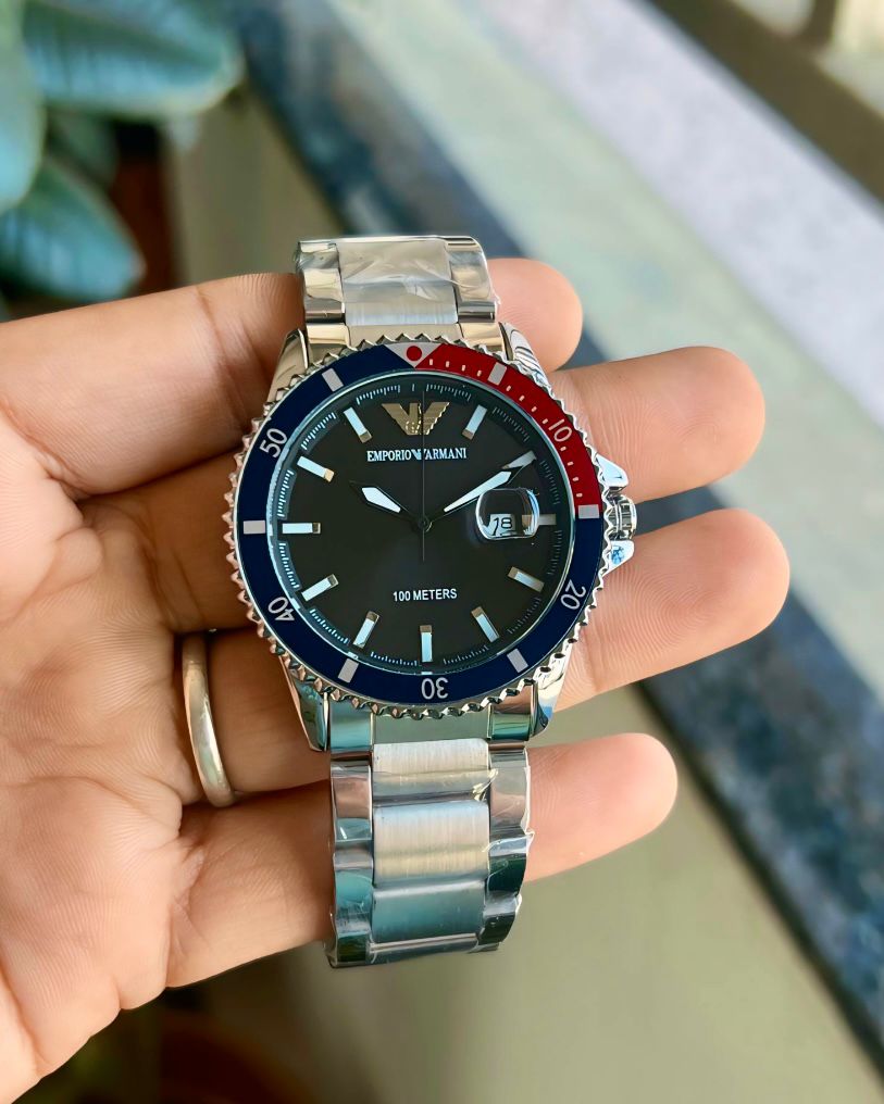 The Emporio Armani Pepsi Black Dial watch is designed for the modern man who values both style and functionality. Its striking green face is complemented by luminous figures, ensuring you can tell the time even in low light. With a robust case size of 42mm, this watch exudes confidence and sophistication.