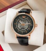The Emporio Armani Skeleton Rosegold Watch is a striking timepiece that beautifully blends elegance with a hint of mystery. The full rose gold case catches the light perfectly, while the transparent skeleton dial allows you to admire the intricate workings of the watch’s automatic movement. It’s not just a visual delight but also a conversation starter.