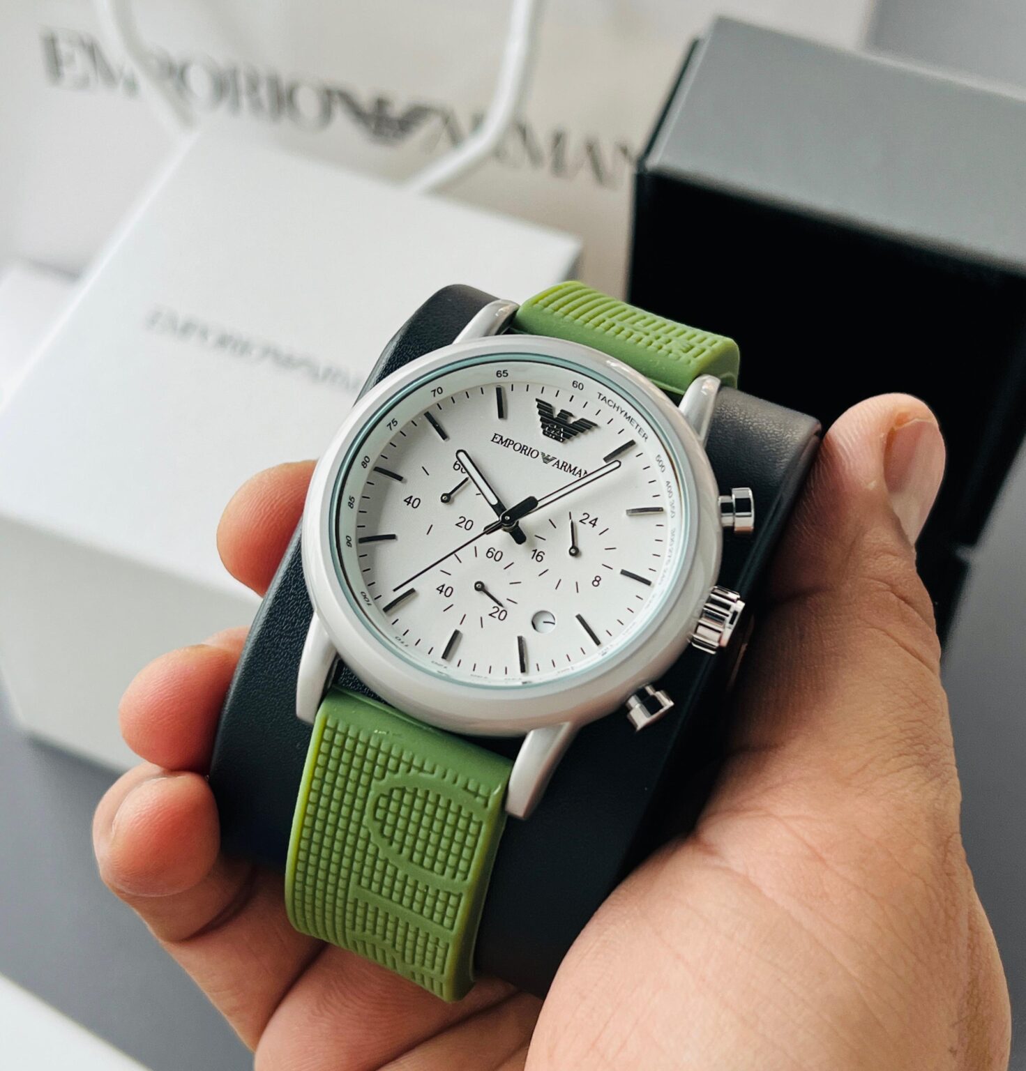 The Emporio Armani Sports White Dial Green Strap is a stylish companion for those who appreciate both functionality and design. This watch features a crisp white dial that allows for easy reading, complemented by elegant white needle hands. Whether you’re at the gym or in a meeting, it seamlessly fits into any setting.