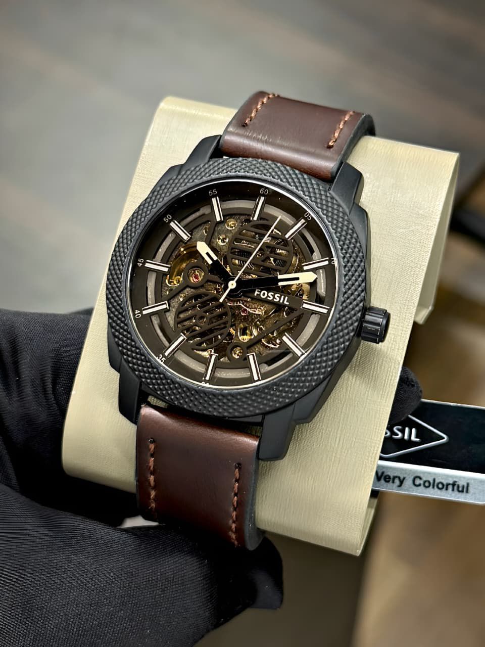 The Fossil ME3254 features a striking black skeleton dial and a durable brown leather strap, perfect for both casual and formal occasions.