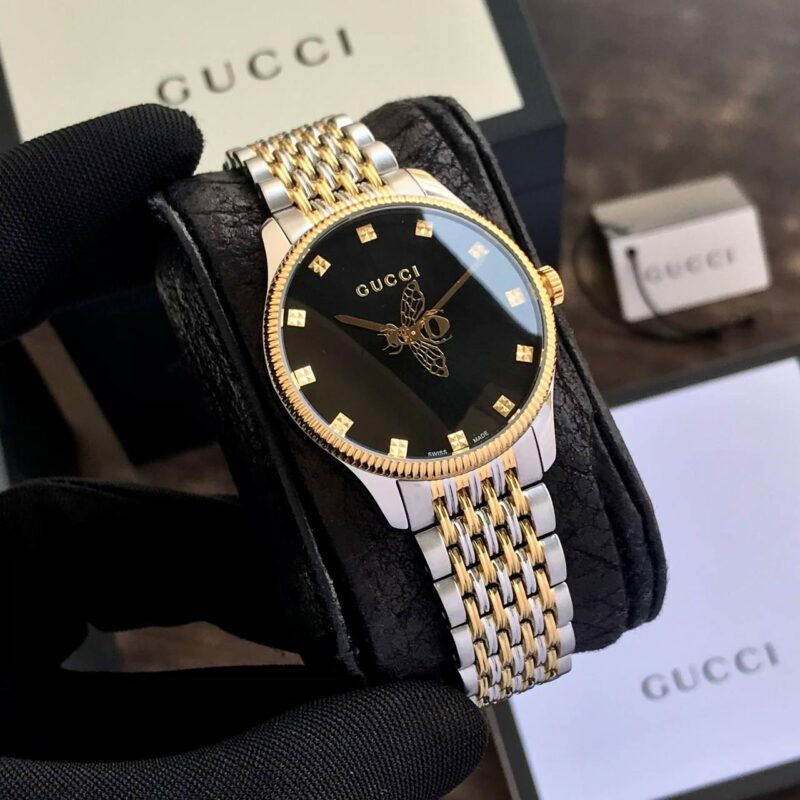 The Gucci G-Timeless Slim Bee is a stunning timepiece that effortlessly combines elegance and functionality. With a 36mm solid steel back case and a sleek black dial, this watch is not just about telling time; it’s a statement piece. The two-tone metal chain belt adds a modern twist, making it versatile enough for both casual and formal settings.