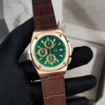 - Green chronograph dial with rose gold and luminous indices