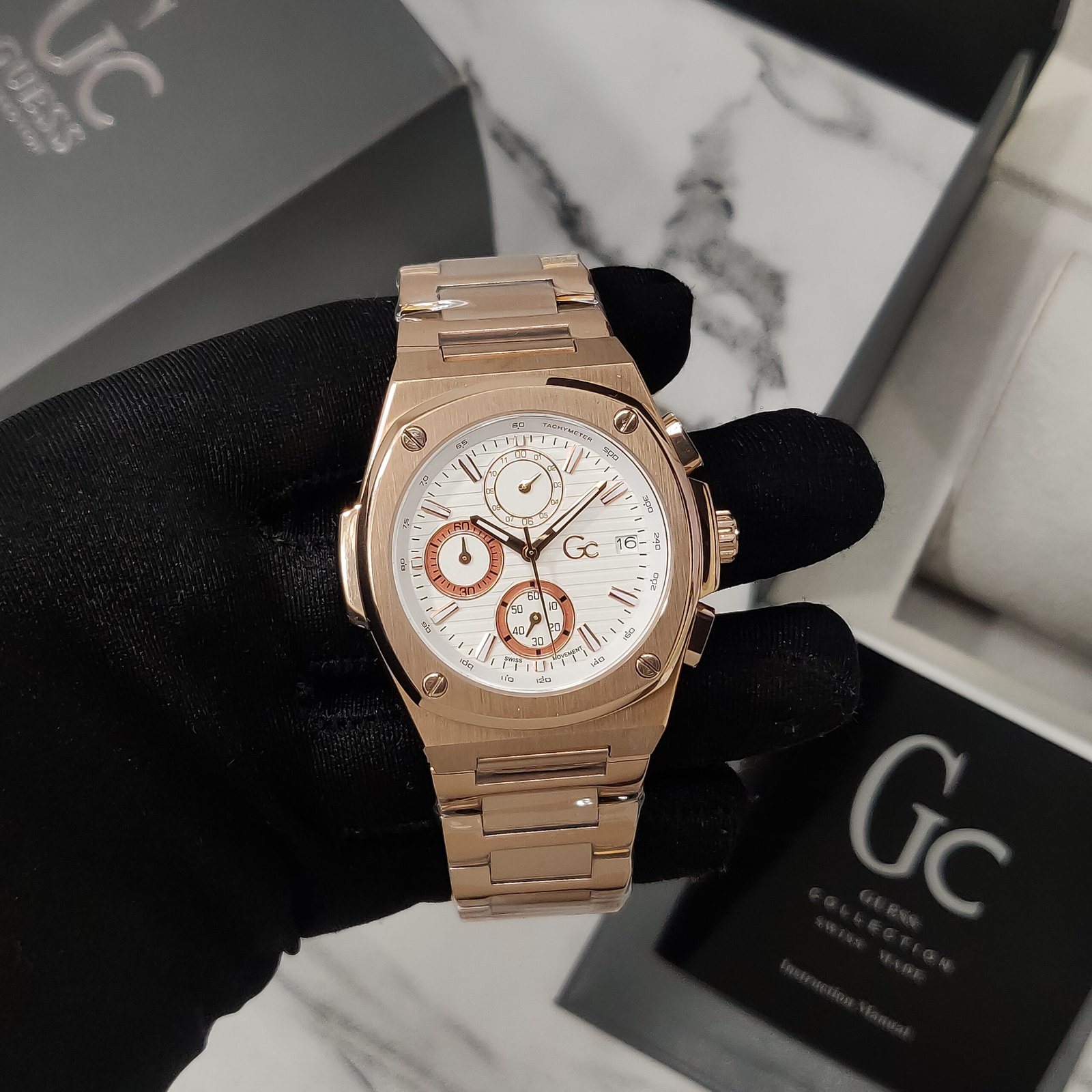 The stainless-steel RG chain with a butterfly clasp offers a secure and comfortable fit, making it a great companion for your wrist. Elevate your style with the Guess Coussine Shape Chronograph—where elegance meets precision.
