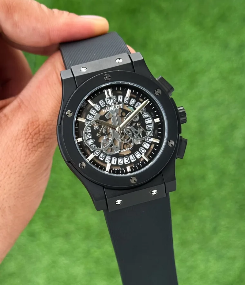 The Hublot Big Bang 7AAA watch is a perfect blend of style and functionality, crafted for the modern man who appreciates precision and elegance. Featuring a robust black steel case paired with a sleek black fibre strap, this timepiece showcases a stunning black dial that is both bold and sophisticated.