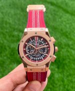 The Hublot Big Bang Chronograph 7AAA is a remarkable watch that effortlessly combines style and functionality. With its bold red leather strap, it adds a vibrant touch to any outfit, making it perfect for those who want to stand out.