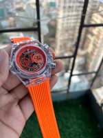 The Hublot Big Bang Skeleton Chronograph is a standout piece for those who appreciate bold and sporty designs. Its striking transparent case showcases the intricate details of the watch, all held together with Hublot’s signature screws. The vibrant orange dial not only adds a splash of color but also enhances the watch’s dynamic aesthetic.