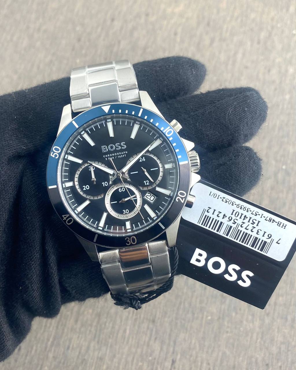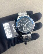 The Hugo Boss Chronograph is a striking timepiece designed for those who appreciate both functionality and style. Its 44mm stainless steel case is complemented by a bold blue bezel, giving it a fresh and modern look on your wrist.
