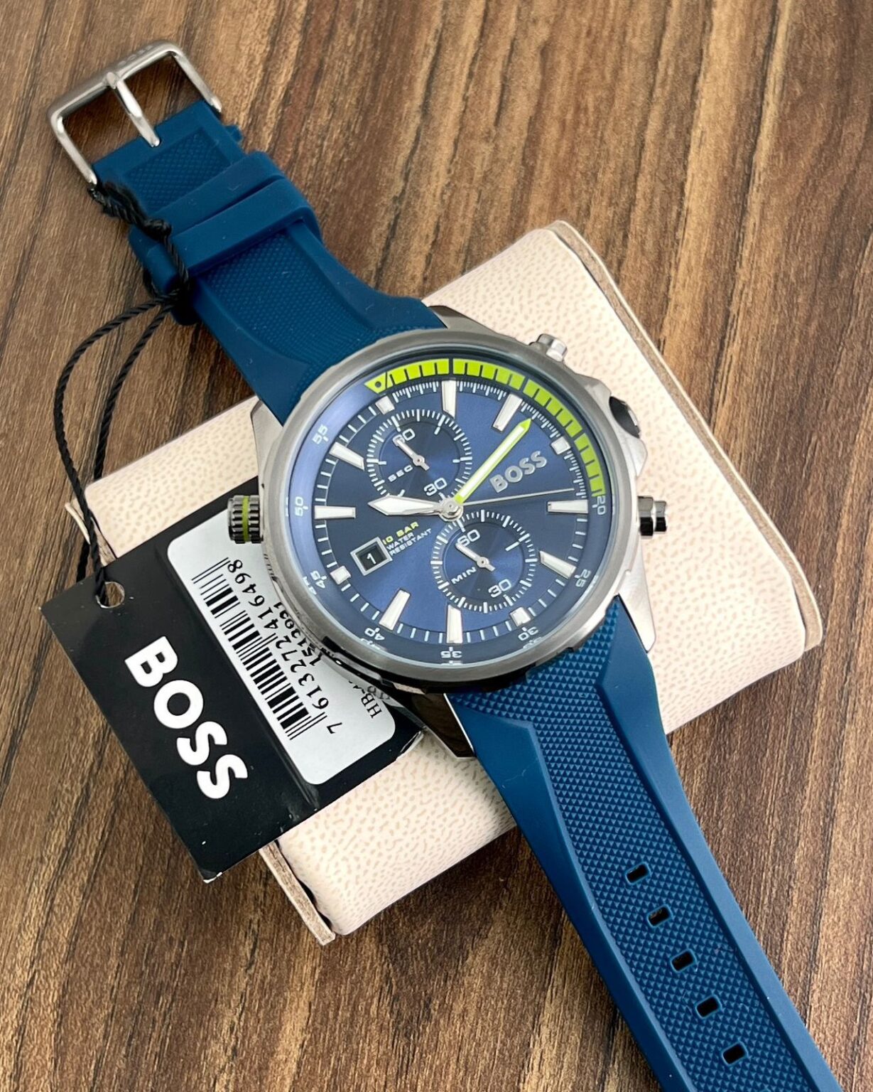 This Hugo Boss model features a blue dial with tachometer functionality and a durable silicone strap, perfect for any occasion.