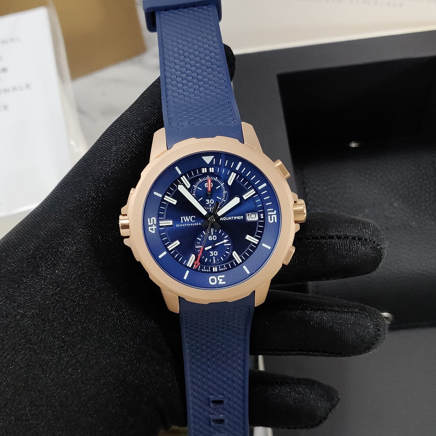 The IWC Aquatimer Chronograph is a stunning piece that combines the robustness of a dive watch with the elegance of rose gold. With a 44mm case, this watch commands attention while remaining practical for daily wear. The black dial features luminous hour markers that ensure readability in all conditions, making it a reliable companion whether you’re underwater or in the boardroom.
