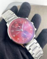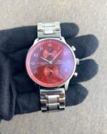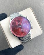 The IWC Schaffhausen Silver Chronograph is a striking blend of style and precision, designed for those who appreciate a refined timepiece. With its vibrant red dial and luminous hands, reading the time is effortless, whether day or night.