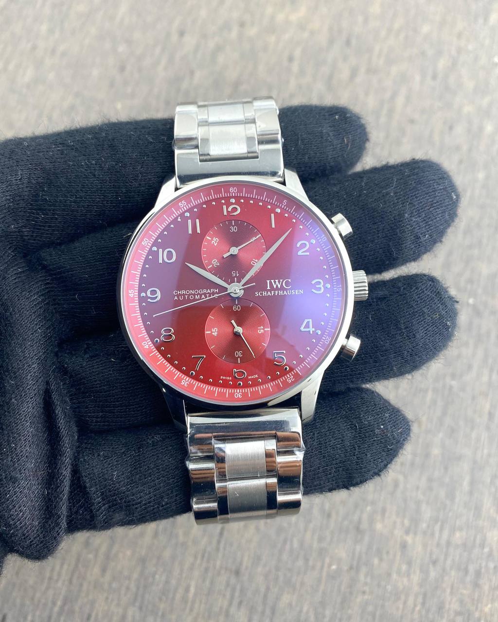 This IWC Schaffhausen Silver Chronograph boasts a striking red dial, stainless steel case, and reliable automatic movement, blending style with functionality.