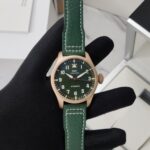 The IWC Spitfire Big Pilot is a remarkable timepiece that embodies the spirit of aviation. With a robust 43mm stainless steel case featuring a striking bronze finish, this watch is designed for those who appreciate both functionality and style. The green dial is not just visually appealing but also practical, showcasing luminous hands that ensure readability in all lighting conditions, along with a handy date indicator.