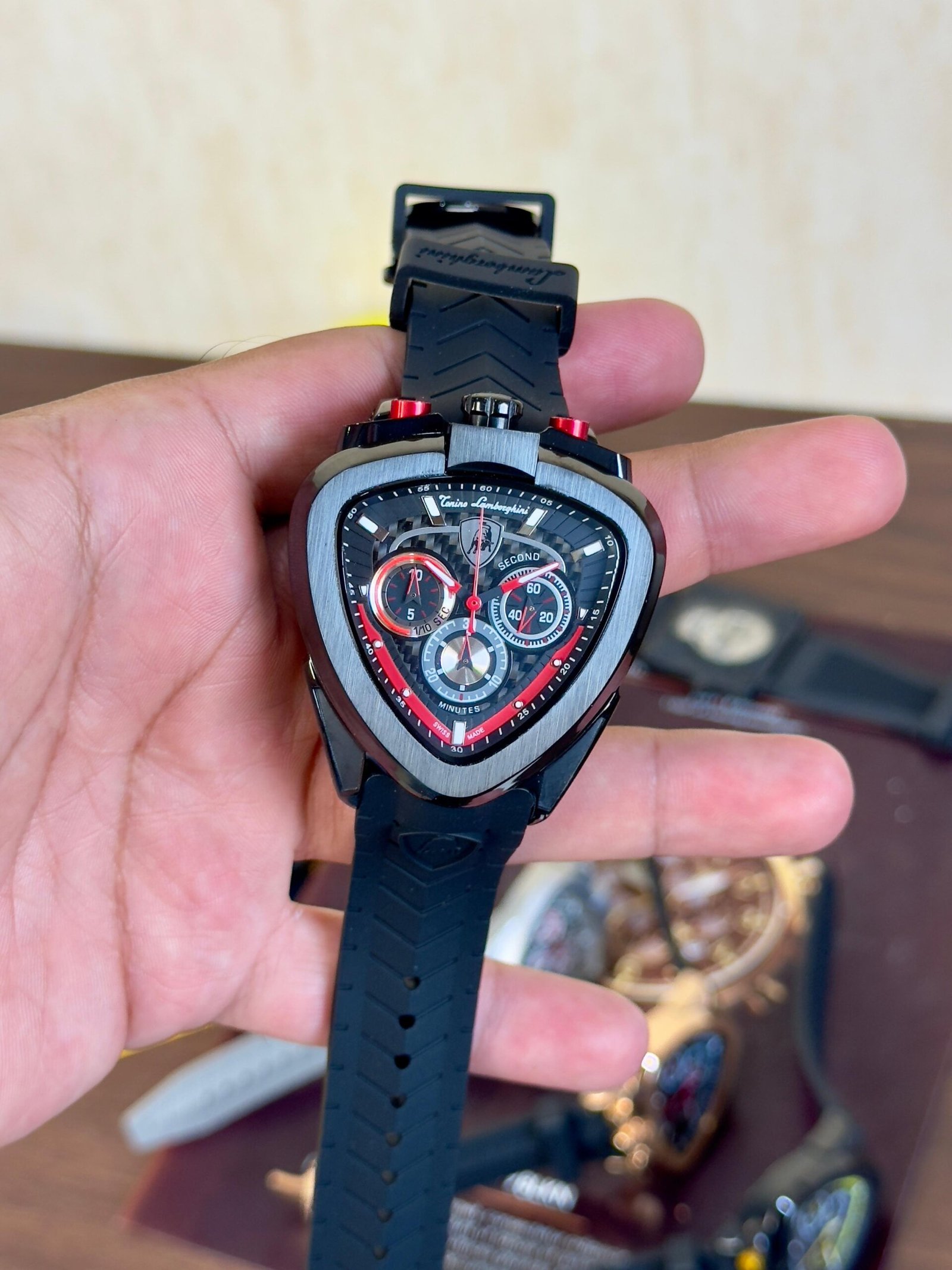 - Stunning Lamborghini dial with a tachymeter steel bezel
