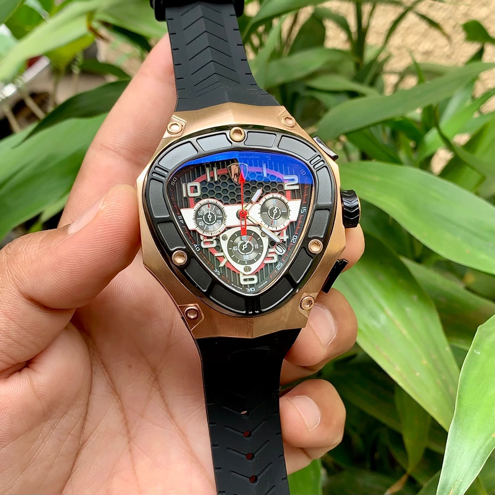 - Stunning Lamborghini dial with a rosegold steel tachymeter bezel