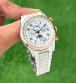 The Longines Master Collection Moonphase is a captivating blend of artistry and functionality. With its impressive 43mm dial, this timepiece is designed to stand out while offering a wealth of features. The working chronograph adds a sporty edge, while the day and month indicators keep you informed at a glance.