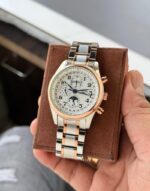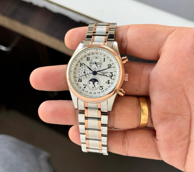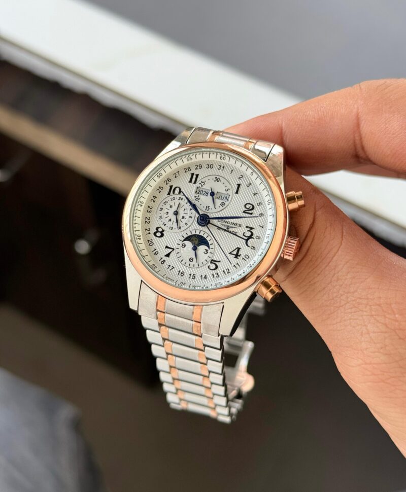 The Longines Moon Phase Automatic is a captivating blend of functionality and elegance. At 42mm, its steel case offers a solid presence on the wrist while remaining comfortable for daily wear. The stunning Silver Barleycorn Moon Phase dial not only captures attention but also features a sophisticated moon phase display, ensuring you never miss a celestial moment.