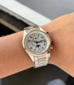 - Chronograph: Central 60 seconds hand, moon phase display with 12 hours counter at 6 o’clock and 30 minutes counter with day and month display at 12 o’clock