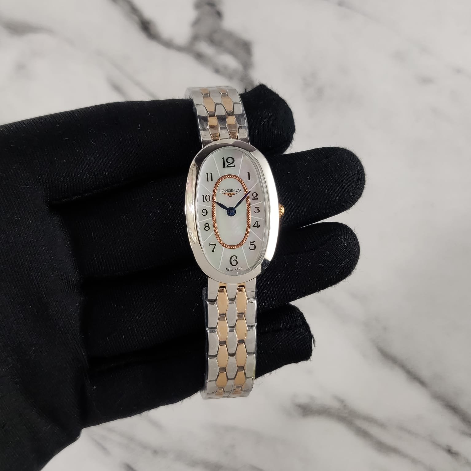 The Longines Symphonette L23055837 captures elegance and sophistication in a compact design. The oval-shaped stainless-steel case, measuring just 19mm by 30mm, is adorned with a stunning studded bezel, making it an eye-catching addition to your collection.