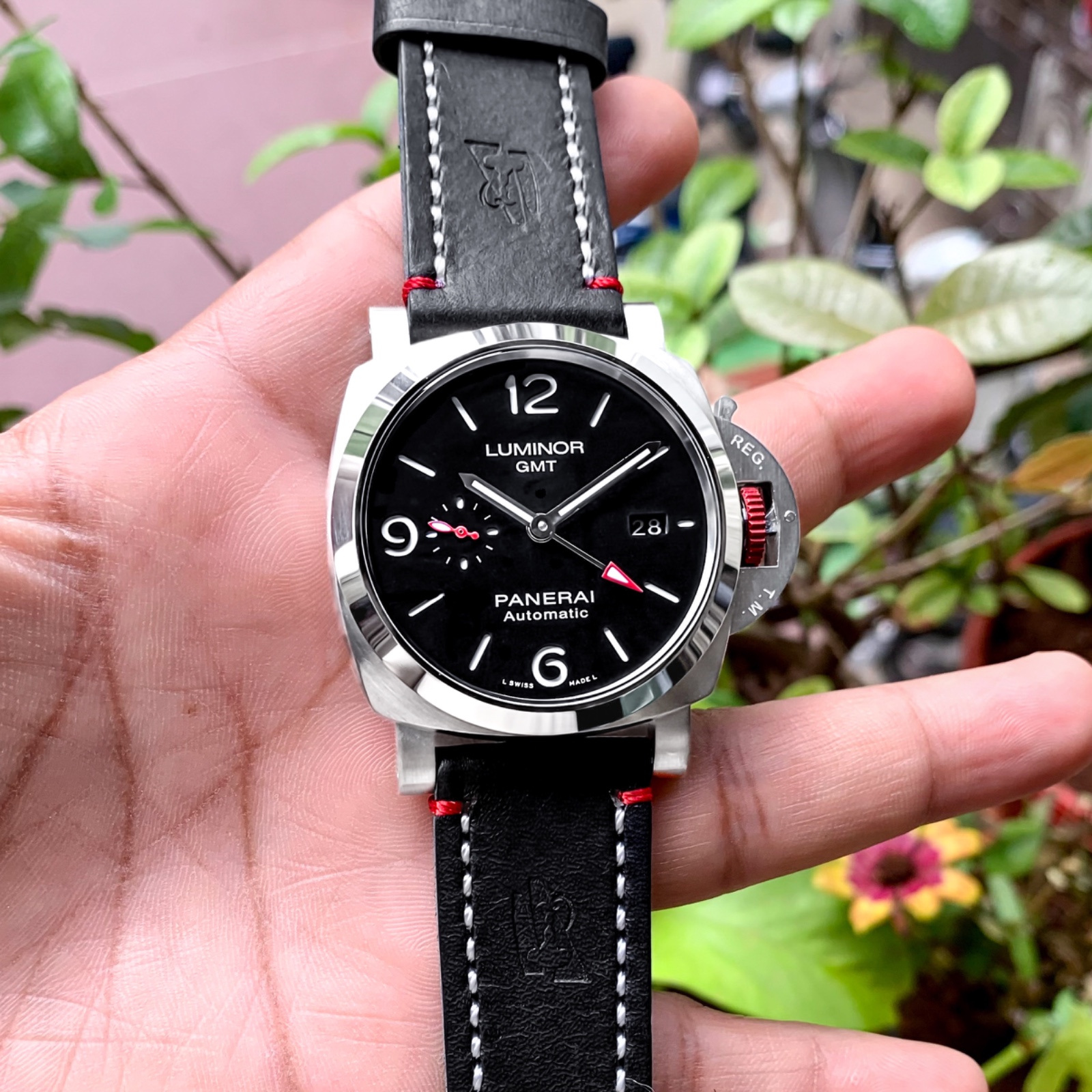 - Stainless steel case and bezel with a striking red Luminor crown