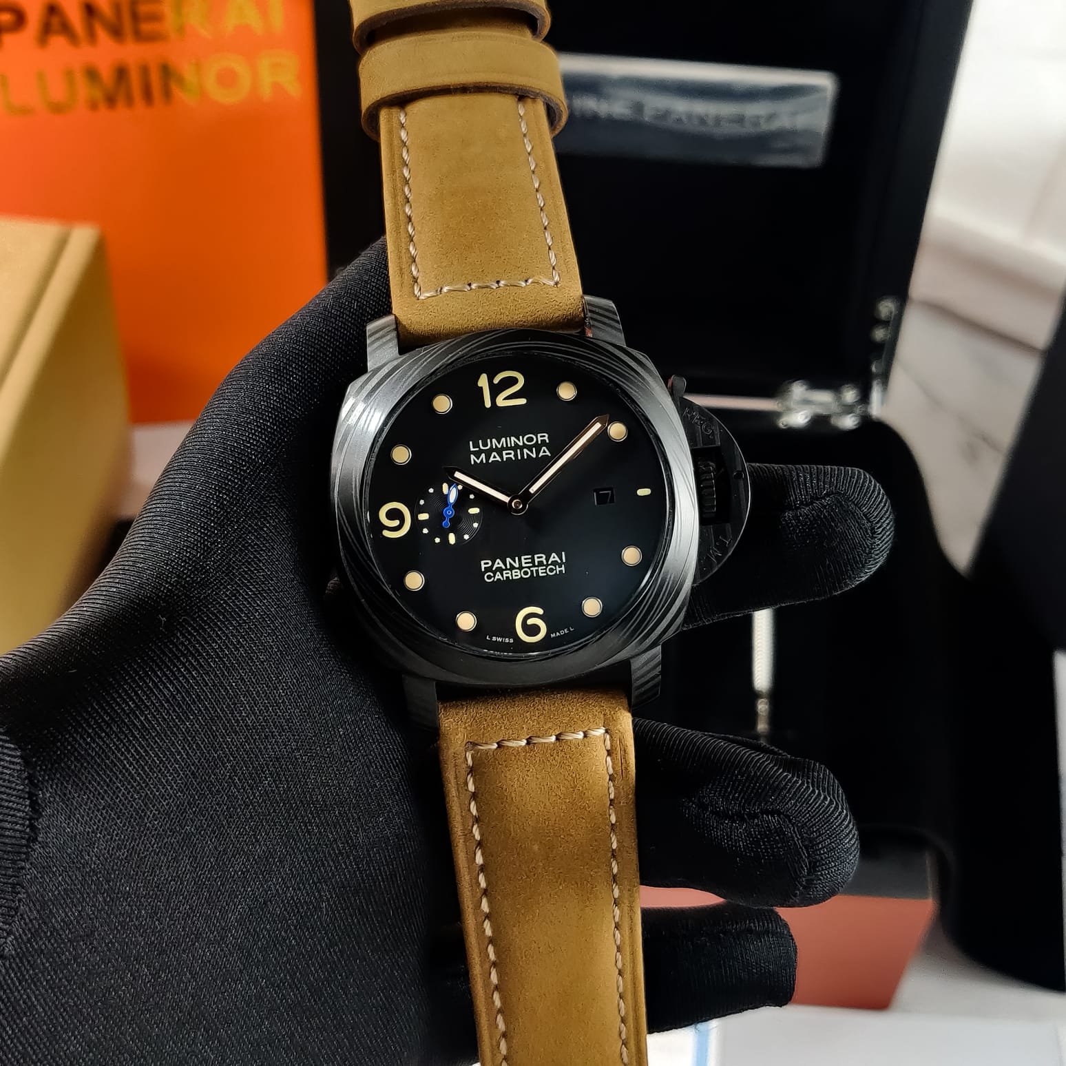 The Panerai Luminor Marina Carbotech Black is a statement piece that combines functionality with a striking design. With a robust 44mm matte black stainless steel case, it’s built for those who appreciate both strength and style.