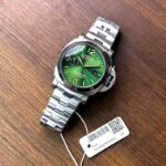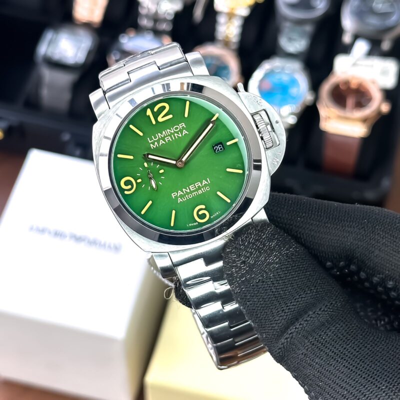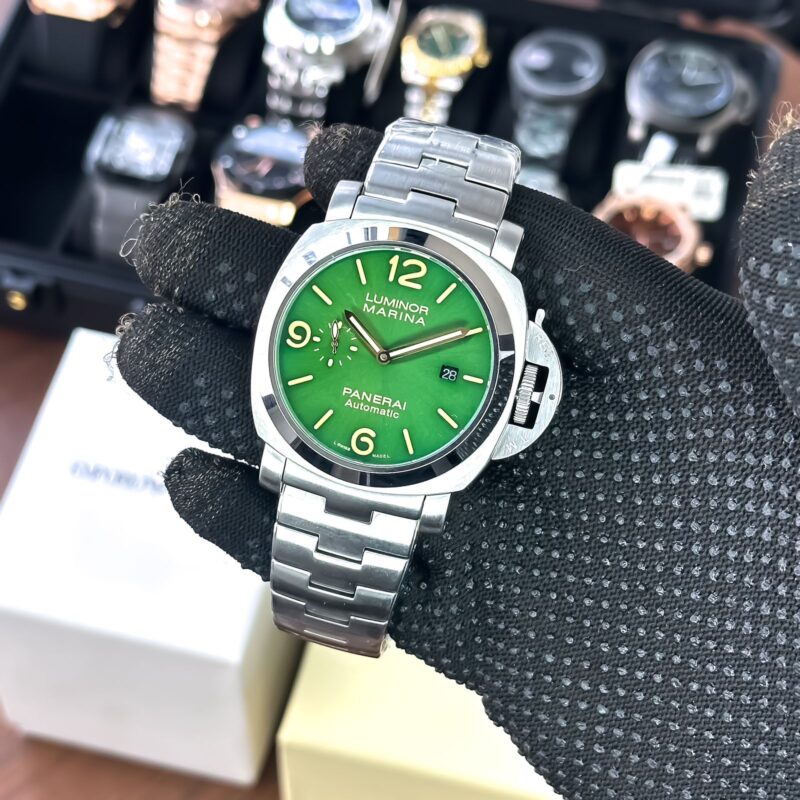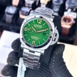 The Panerai Luminor Marina PAM1950 is a stunning timepiece that combines functionality with style. The striking green dial is not only visually appealing but also features radium hands that glow in the dark, making it easy to read in any lighting. With a robust 46mm case, it commands attention on the wrist while remaining comfortable to wear.
