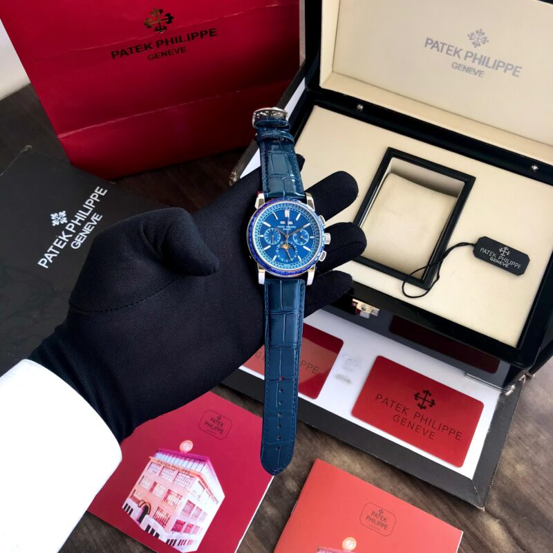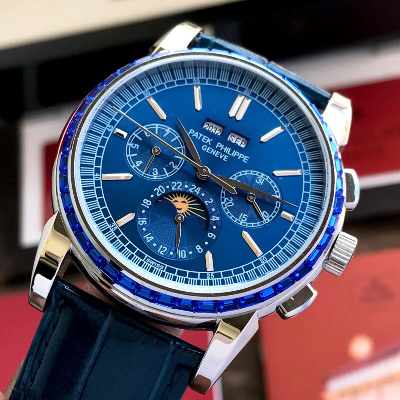 The Patek Philippe 5271/11P Perpetual Calendar Blue is a stunning watch that combines elegance with functionality. The blue dial is not just visually striking; it also features working chronographs and a date indicator, giving you both style and utility. The sapphire glass ensures durability while providing a clear view of the intricate details beneath.
