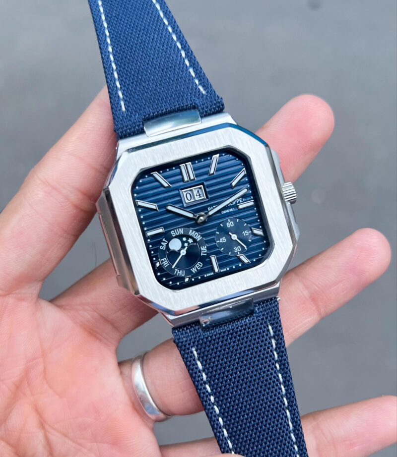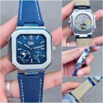 The Patek Philippe Cubitus 5822P-001 watch is a stunning addition for anyone who appreciates elegance and functionality in a timepiece. The striking sunburst blue dial is not just visually captivating; it features an embossed horizontal pattern that adds depth and texture to the watch. With its 41mm stainless steel case, it strikes the perfect balance between boldness and wearability.