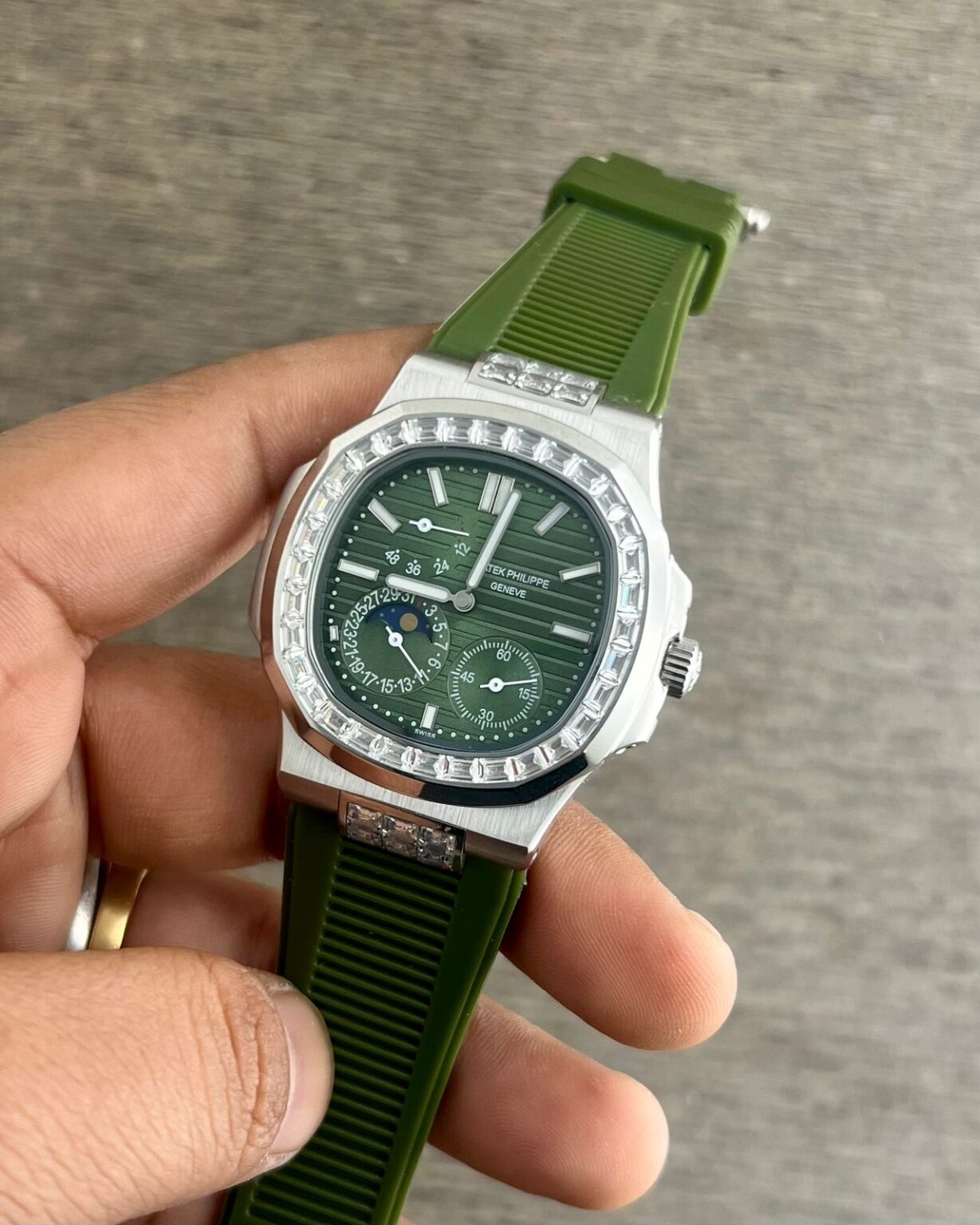 This is of Patek Philippe Nautilus Diamond Bezel Green Dial.