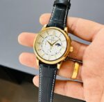 Its sleek black leather strap is complemented by a heavy clasp lock, providing both comfort and security on your wrist. Plus, with a water-resistant design, you can wear it confidently in various conditions. The watch comes beautifully packaged in a Patek Philippe brand name box, making it a perfect gift choice.