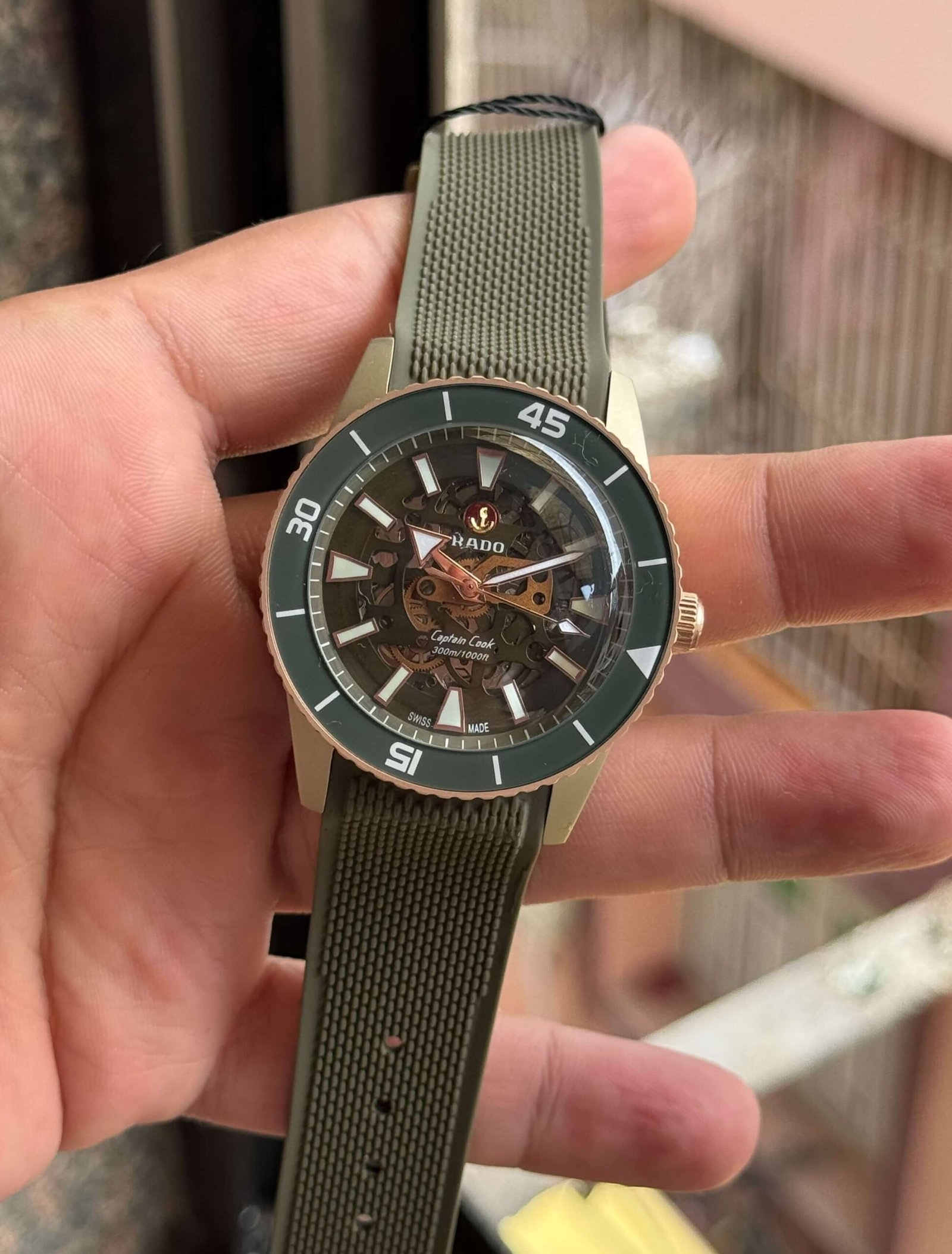 The Rado Captain Cook High Tech Ceramic Green Automatic is a watch that beautifully combines vintage charm with modern technology. With its stunning 43mm case crafted from high-tech ceramic, stainless steel, and titanium, it offers both durability and a sleek aesthetic. The open skeleton dial not only showcases the intricate mechanism inside but also adds a unique flair that sets this timepiece apart.
