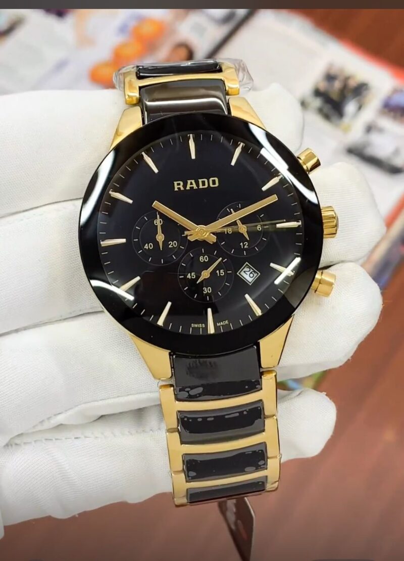 The Rado Centrix Chronograph is a stunning piece designed for those who appreciate both functionality and style. With its striking black dial and black golden two-tone ceramic strap, this watch is an ideal accessory for any occasion, whether casual or formal.