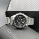 The Rado Chronograph Silver Black Dial is a stylish, functional wristwatch featuring a 44mm dial, chronograph functions, and a durable stainless steel bracelet.