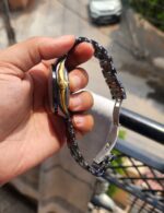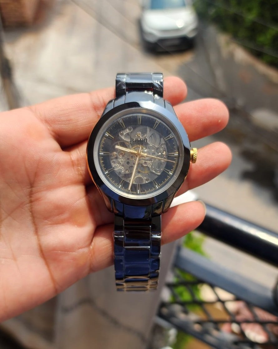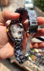 The black chain bracelet complements the bold design, making it an eye-catching accessory for any occasion. Whether you’re dressing up for a formal event or going casual, this watch effortlessly elevates your style. With its open case back, you’ll enjoy a glimpse of the inner mechanics, making it a conversation starter among watch enthusiasts.