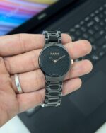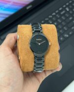 Powered by a reliable Quartz Miyota movement, this watch promises accuracy and peace of mind with a one-year warranty. The iconic black dial features a striking rose gold Rado branding that adds a touch of sophistication, while the butterfly lock on the ceramic strap ensures a secure and comfortable fit.