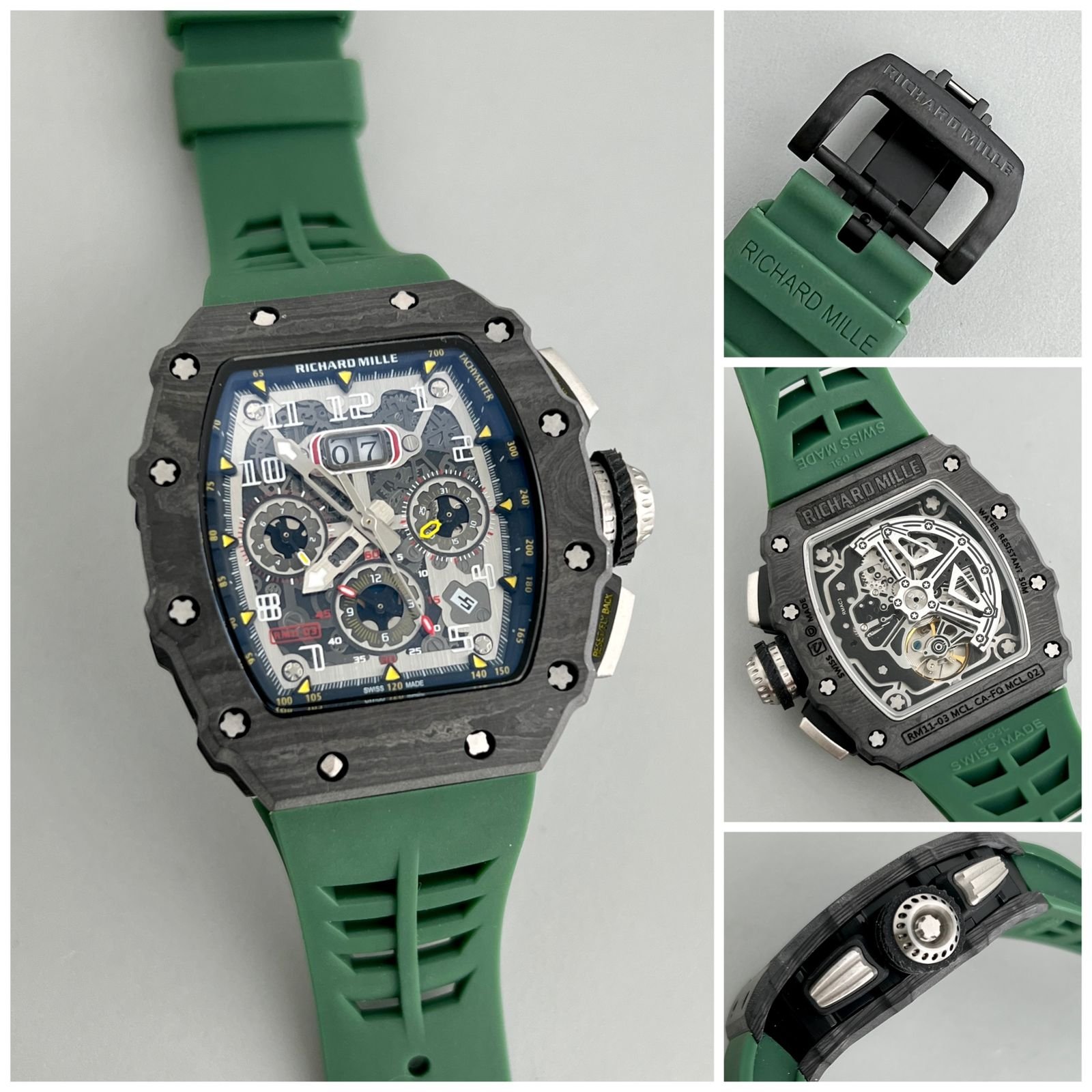 The black crock leather case paired with a vibrant green rubber strap makes for a striking visual contrast, ensuring it stands out on any wrist. The innovative Richard Mille branding lock with magnetic clips adds both security and a touch of sophistication.